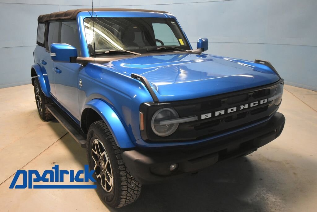 2021 Ford Bronco Outer Banks We want you to shop confidently for your next used car at D-Patrick Boonville Ford and We make it EASY! Buy this used vehicle 100% online or in-store, EASY. Saving time at the dealership, EASY! Financing, EASY! Get pre-approved online or in-store with one of our many lenders, EASY. Finding the car you love at the price you want, EASY! This pre-owned vehicle was put through an extensive inspection before hitting our lot. Because of this, we are able to offer a 3-month/3,000-mile comprehensive limited warranty. You also get our Love It or Return It 5-day, 300-mile Exchange Policy. See our website for more details on both. We also offer extended service plans, vehicle protection plans, and offer a free to you CarFax vehicle history report. *Prices listed do not include a $250 documentation fee, applicable tax, title, tags, license, or $195 service and preparation. All pricing, vehicle information, and features (such as accessories and color) are believed to be accurate, but we do not warrant or guarantee such accuracy. The prices shown above may vary from region to region, and incentives are subject to change. Some offers listed may not be available to all customers. All online sale commitments are subject to confirmation of continued availability of vehicle. Once availability is confirmed, online sale agreement becomes binding upon the parties. If any information found on the website is thought to be erroneous, please verify information with a customer service representative. See dealer for full details. Looking to sell your current vehicle? We buy cars for cash. 18 Bright Machined Aluminum Wheels, 4-Wheel Disc Brakes, 4.27 Axle Ratio, 6 Speakers, ABS brakes, Air Conditioning, Alloy wheels, AM/FM radio: SiriusXM with 360L, AM/FM Stereo, Auto High-beam Headlights, Auto-dimming Rear-View mirror, Automatic temperature control, Brake assist, Compass, Connected Navigation, Delay-off headlights, Driver door bin, Driver vanity mirror, Dual front impact airbags, Dual front side impact airbags, Emergency communication system: 911 Assist, Exterior Parking Camera Rear, Front anti-roll bar, Front Bucket Seats, Front Center Armrest, Front dual zone A/C, Front fog lights, Front reading lights, Front wheel independent suspension, Fully automatic headlights, Heated Cloth Bucket Seats, Heated door mirrors, Heated front seats, Illuminated entry, Integrated roll-over protection, Leather Shift Knob, Low tire pressure warning, Navigation system: Connected Navigation, Occupant sensing airbag, Outside temperature display, Overhead airbag, Overhead console, Panic alarm, Passenger door bin, Passenger vanity mirror, Power door mirrors, Power steering, Power windows, Radio data system, Remote keyless entry, Security system, SiriusXM Radio w/360L, Speed control, Split folding rear seat, Steering wheel mounted audio controls, SYNC 4, Tachometer, Telescoping steering wheel, Tilt steering wheel, Traction control, Trip computer, Variably intermittent wipers, Voltmeter. 4D Sport Utility Outer Banks 10-Speed Automatic 2.3L EcoBoost I-4 4WD Velocity Blue Metallic CALL US TODAY BEFORE THIS ONE GETS AWAY-- (812) 897-5838 or shop online at www.boonvilleford.com.