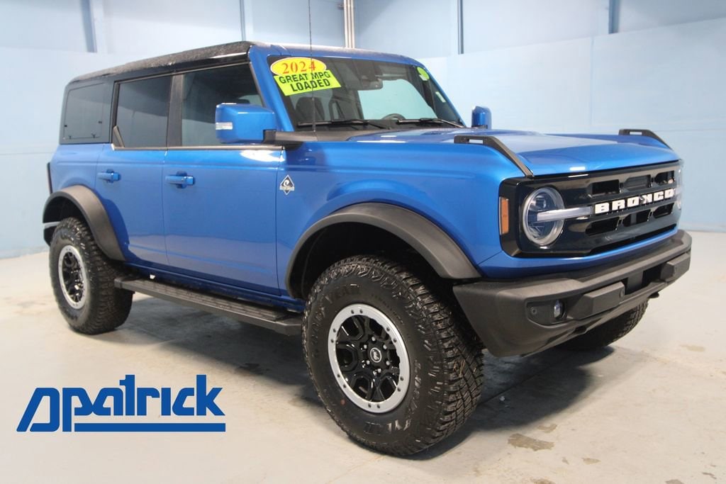 2024 Ford Bronco Outer Banks We want you to shop confidently for your next used car at The BIG Ford Store, D-Patrick Ford. We are located on Highway 41 and Walnut in Evansville, right next to the Lloyd Expressway. Buy this used vehicle 100% online or in-store. This pre-owned vehicle was put through an extensive inspection before hitting our lot. Because of this, we are able to offer a 3-month/3,000-mile comprehensive limited warranty. You also get our Love It or Return It 5-day, 300-mile Exchange Policy. See our website for more details on both. We also offer extended service plans, vehicle protection plans, and offer a CarFax vehicle history report. *Prices listed do not include a $250 documentation fee, applicable tax, title, tags, license, or $195 service and preparation. All pricing, vehicle information, and features (such as accessories and color) are believed to be accurate, but we do not warrant or guarantee such accuracy. The prices shown above may vary from region to region, and incentives are subject to change. Some offers listed may not be available to all customers. All online sale commitments are subject to confirmation of continued availability of vehicle. Once availability is confirmed, online sale agreement becomes binding upon the parties. If any information found on the website is thought to be erroneous, please verify information with a customer service representative. See dealer for full details. Looking to sell your current vehicle? We buy cars for cash. Every test drive at D-Patrick Ford in Evansville earns $10 to a local charity. Schedule your test drive today! 18 Bright Machined Aluminum Wheels, 4-Wheel Disc Brakes, 7 Speakers, ABS brakes, Air Conditioning, Alloy wheels, AM/FM radio: SiriusXM with 360L, AM/FM Stereo, Auto High-beam Headlights, Auto-dimming Rear-View mirror, Automatic temperature control, Brake assist, Compass, Connected Navigation, Delay-off headlights, Driver door bin, Driver vanity mirror, Dual front impact airbags, Dual front side impact airbags, Electronic Stability Control, Emergency communication system: 911 Assist, Equipment Group 314A High/Lux Package, Exterior Parking Camera Rear, Front anti-roll bar, Front Bucket Seats, Front Center Armrest, Front dual zone A/C, Front fog lights, Front reading lights, Front wheel independent suspension, Fully automatic headlights, Hard Top Sound Deadening Headliner, Heated door mirrors, Heated front seats, Heated Leather-Trimmed/Vinyl Bucket Seats, High Clearance Fender Flares, High Clearance Suspension, Illuminated entry, Integrated roll-over protection, Leather Shift Knob, Low tire pressure warning, Navigation system: Connected Navigation, Occupant sensing airbag, Outside temperature display, Overhead airbag, Overhead console, Panic alarm, Passenger door bin, Passenger vanity mirror, Power door mirrors, Power driver seat, Power passenger seat, Power steering, Power windows, Radio data system, Rear seat center armrest, Remote keyless entry, Sasquatch Package, Security system, Shadow Black Painted Hard Top, SiriusXM Radio w/360L, Speed control, Split folding rear seat, Steering wheel mounted audio controls, SYNC 4, Tachometer, Telescoping steering wheel, Tilt steering wheel, Traction control, Trip computer, Variably intermittent wipers, Voltmeter, Wheels: 17 Black High Gloss-Painted Aluminum. CARFAX One-Owner. 4D Sport Utility Outer Banks 10-Speed Automatic 2.3L EcoBoost I-4 4WD Velocity Blue Metallic CALL TODAY (812) 625-4823 OR SHOP ONLINE AT WWW.DPATRICKFORD.COM.