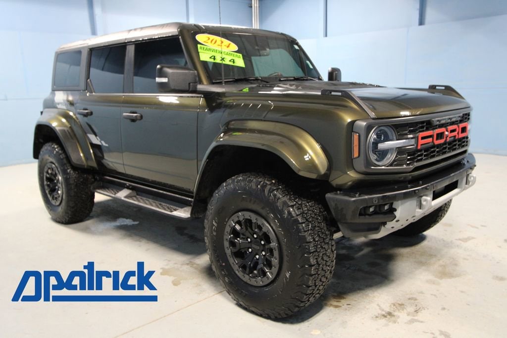 2024 Ford Bronco Raptor We want you to shop confidently for your next used car at The BIG Ford Store, D-Patrick Ford. We are located on Highway 41 and Walnut in Evansville, right next to the Lloyd Expressway. Buy this used vehicle 100% online or in-store. This pre-owned vehicle was put through an extensive inspection before hitting our lot. Because of this, we are able to offer a 3-month/3,000-mile comprehensive limited warranty. You also get our Love It or Return It 5-day, 300-mile Exchange Policy. See our website for more details on both. We also offer extended service plans, vehicle protection plans, and offer a CarFax vehicle history report. *Prices listed do not include a $250 documentation fee, applicable tax, title, tags, license, or $195 service and preparation. All pricing, vehicle information, and features (such as accessories and color) are believed to be accurate, but we do not warrant or guarantee such accuracy. The prices shown above may vary from region to region, and incentives are subject to change. Some offers listed may not be available to all customers. All online sale commitments are subject to confirmation of continued availability of vehicle. Once availability is confirmed, online sale agreement becomes binding upon the parties. If any information found on the website is thought to be erroneous, please verify information with a customer service representative. See dealer for full details. Looking to sell your current vehicle? We buy cars for cash. Every test drive at D-Patrick Ford in Evansville earns $10 to a local charity. Schedule your test drive today! 10 Speakers, 4-Wheel Disc Brakes, ABS brakes, Air Conditioning, Alloy wheels, AM/FM radio: SiriusXM with 360L, Auto High-beam Headlights, Auto-dimming Rear-View mirror, Automatic temperature control, Brake assist, Compass, Connected Navigation, Convertible HardTop, Convertible roof lining, Delay-off headlights, Driver door bin, Driver vanity mirror, Dual front impact airbags, Dual front side impact airbags, Electronic Stability Control, Emergency communication system: 911 Assist, Equipment Group 374A High/Lux Package, Exterior Parking Camera Rear, Front anti-roll bar, Front Bucket Seats, Front Center Armrest, Front dual zone A/C, Front fog lights, Front reading lights, Front wheel independent suspension, Fully automatic headlights, Garage door transmitter, Glass rear window, Heated door mirrors, Heated front seats, Heated steering wheel, Illuminated entry, Integrated roll-over protection, Interior Carbon Fiber Pack 6, Leather Shift Knob, Low tire pressure warning, Marine Grade Vinyl Bucket Seats, Navigation system: Connected Navigation, Occupant sensing airbag, Outside temperature display, Overhead airbag, Overhead console, Panic alarm, Passenger door bin, Passenger vanity mirror, Power door mirrors, Power steering, Power windows, Radio data system, Radio: B&O Sound System by Bang & Olufsen, Raptor Side & Hood Graphics, Rear anti-roll bar, Rear seat center armrest, Rear window defroster, Rear window wiper, Remote keyless entry, Security system, SiriusXM Radio w/360L, Speed control, Split folding rear seat, Steering wheel mounted audio controls, SYNC 4, Tachometer, Telescoping steering wheel, Tilt steering wheel, Traction control, Trip computer, Turn signal indicator mirrors, Variably intermittent wipers, Voltmeter, Wheels: 17 Black High Gloss-Painted Aluminum, Wheels: 17 Dark Carbonized Gray Alloy Painted. 4D Sport Utility Raptor 10-Speed Automatic 3.0L EcoBoost V6 4WD Shelter Green Metallic CALL TODAY (812) 625-4823 OR SHOP ONLINE AT WWW.DPATRICKFORD.COM.