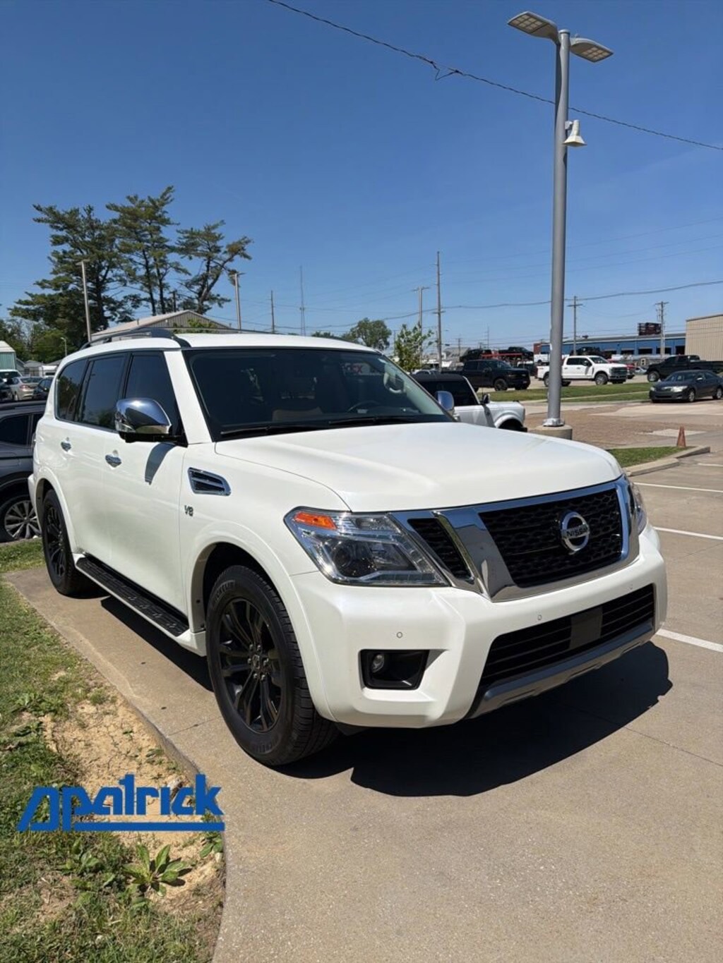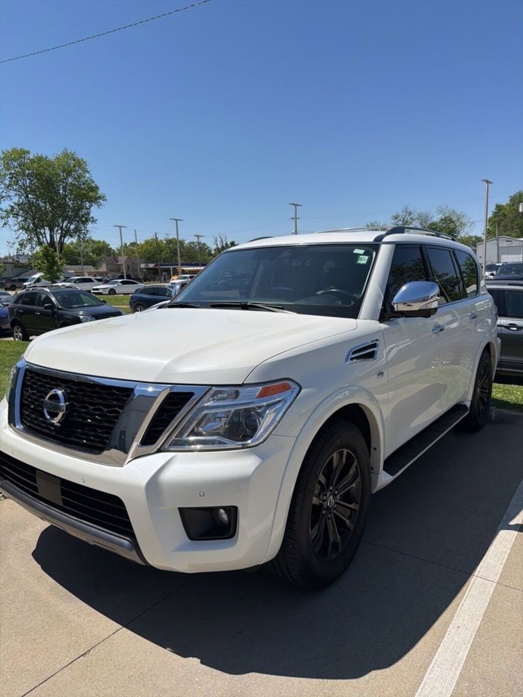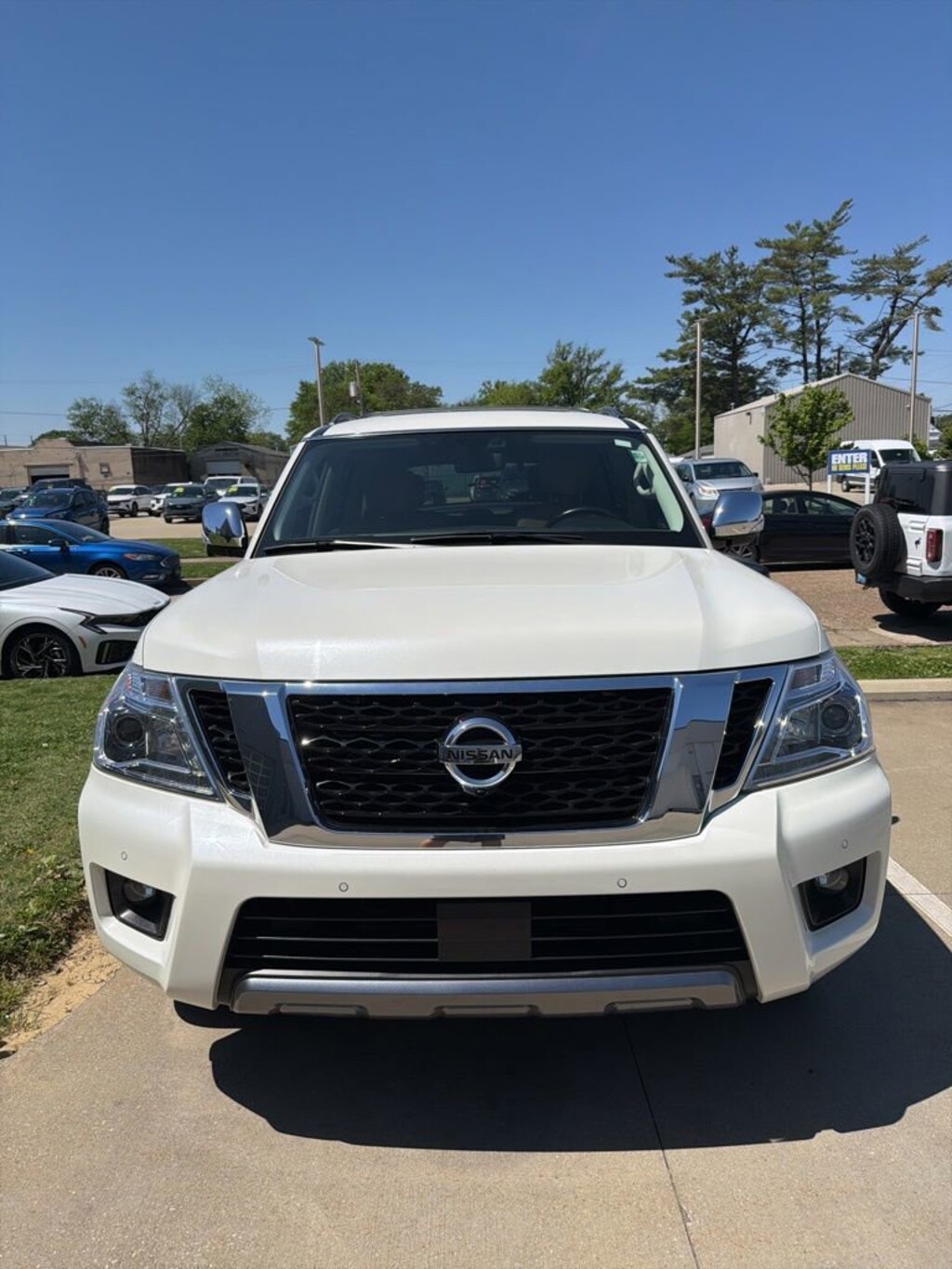 Every test drive at D-Patrick Ford in Evansville earns $10 to a local charity. Schedule your test drive today! 4WD, 13 Speakers, 2.937 Axle Ratio, 2nd Row Captain's Chairs, 2nd Row Center Console w/ Padded Armrest, 3rd row seats: split-bench, 4-Wheel Disc Brakes, A/V remote, ABS brakes, Air Conditioning, Alloy wheels, AM/FM radio: SiriusXM, Anti-whiplash front head restraints, Auto tilt-away steering wheel, Auto-dimming door mirrors, Auto-dimming Rear-View mirror, Auto-leveling suspension, Automatic temperature control, Brake assist, Bumpers: body-color, Captain's Chairs Package, Cargo Package, Carpeted Floor Mats w/ Captain Seat Package, CD player, Cross Bars, Delay-off headlights, Driver door bin, Driver vanity mirror, Dual front impact airbags, Dual front side impact airbags, Electronic Stability Control, Emergency communication system: NissanConnect Services, Four wheel independent suspension, Front anti-roll bar, Front Bucket Seats, Front Center Armrest, Front dual zone A/C, Front fog lights, Front reading lights, Fully automatic headlights, Garage door transmitter: HomeLink, Headphones, Heated & Cooled Front Bucket Seats w/Driver Memory, Heated door mirrors, Heated front seats, Heated rear seats, Heated steering wheel, Illuminated entry, Illuminated Kick Plates, Leather Shift Knob, Leather-Appointed Seat Trim, Low tire pressure warning, Memory seat, Navigation System, Occupant sensing airbag, Outside temperature display, Overhead airbag, Overhead console, Panic alarm, Passenger door bin, Passenger vanity mirror, Power door mirrors, Power driver seat, Power Liftgate, Power moonroof, Power passenger seat, Power steering, Power windows, Radio data system, Radio: AM/FM/SXM/CD/MP3/HD, Rain sensing wipers, Rear air conditioning, Rear anti-roll bar, Rear reading lights, Rear seat center armrest, Rear window defroster, Rear window wiper, Reclining 3rd row seat, Remote keyless entry, Roof rack: rails only, Security system, Special Paint - Pearl White, Speed control, Speed-sensing steering, Speed-Sensitive Wipers, Split folding rear seat, Spoiler, Steering wheel memory, Steering wheel mounted audio controls, Tachometer, Telescoping steering wheel, Tilt steering wheel, Traction control, Trip computer, Turn signal indicator mirrors, Variably intermittent wipers, Ventilated front seats, Voltmeter, Welcome Lighting, Wheels: 20 Machine-Faced Chrome w/Tinted CC, 4WD. Clean CARFAX. 4D Sport Utility Platinum 7-Speed Automatic 5.6L V8 DOHC 32V Endurance 4WD Pearl White Tricoat CALL TODAY (812) 625-4823 OR SHOP ONLINE AT WWW.DPATRICKFORD.COM.