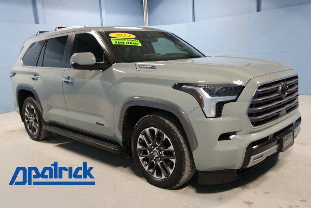 2024 Toyota Sequoia Limited We want you to shop confidently for your next used car at The BIG Ford Store, D-Patrick Ford. We are located on Highway 41 and Walnut in Evansville, right next to the Lloyd Expressway. Buy this used vehicle 100% online or in-store. This pre-owned vehicle was put through an extensive inspection before hitting our lot. Because of this, we are able to offer a 3-month/3,000-mile comprehensive limited warranty. You also get our Love It or Return It 5-day, 300-mile Exchange Policy. See our website for more details on both. We also offer extended service plans, vehicle protection plans, and offer a free to you CarFax vehicle history report. *Prices listed do not include a $250 documentation fee, applicable tax, title, tags, license, or $195 service and preparation. All pricing, vehicle information, and features (such as accessories and color) are believed to be accurate, but we do not warrant or guarantee such accuracy. The prices shown above may vary from region to region, and incentives are subject to change. Some offers listed may not be available to all customers. All online sale commitments are subject to confirmation of continued availability of vehicle. Once availability is confirmed, online sale agreement becomes binding upon the parties. If any information found on the website is thought to be erroneous, please verify information with a customer service representative. See dealer for full details. Looking to sell your current vehicle? We buy cars for cash. Every test drive at D-Patrick Ford in Evansville earns $10 to a local charity. Schedule your test drive today! V6 Hybrid, 10-Speed Automatic, 4WD, ABS brakes, Active Cruise Control, Alloy wheels, Electronic Stability Control, Front dual zone A/C, Heated & Ventilated Front Seats, Heated door mirrors, Heated front seats, Illuminated entry, Low tire pressure warning, Navigation System, Power Liftgate, Power moonroof, Remote keyless entry, Traction control. CARFAX One-Owner. 4D Sport Utility Limited 10-Speed Automatic V6 Hybrid 4WD Lunar Rock CALL TODAY (812) 625-4823 OR SHOP ONLINE AT WWW.DPATRICKFORD.COM.